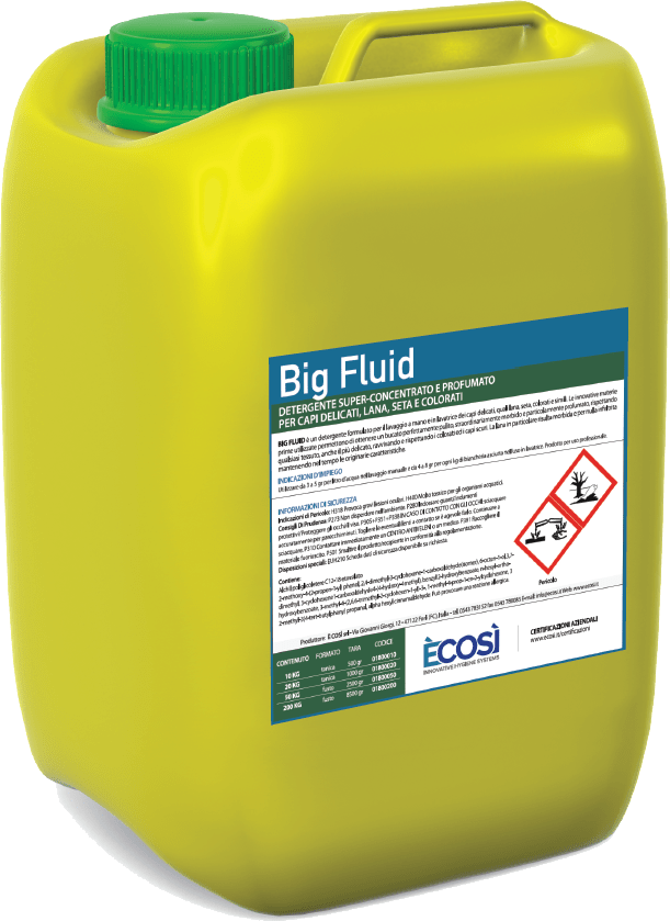 BIG FLUID è un detergente per il lavaggio a mano e in lavatrice dei capi delicati. Le innovative materie prime utilizzate permettono di ottenere un bucato pulito, morbido e profumato, rispettando qualsiasi tessuto e ravvivando i capi colorati e scuri. Sulla lana, ha effetto antinfeltrente e preservante delle caratteristiche originarie.