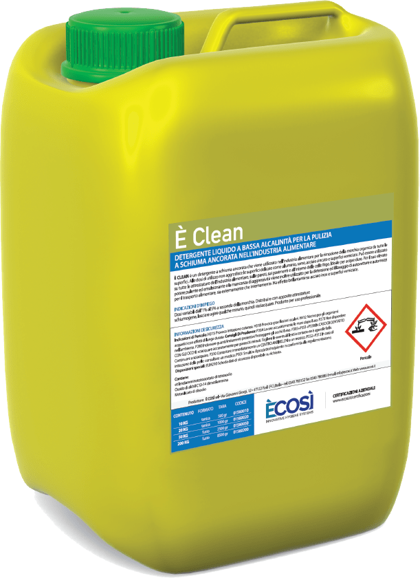 È CLEAN è un detergente a schiuma ancorata per la rimozione della morchia organica da attrezzature dell’industria alimentare, pareti, pavimenti e all’interno delle celle frigo. Alle dosi di utilizzo non aggredisce alluminio, rame, acciaio zincato e superfici verniciate. Viene utilizzato anche per il lavaggio interno ed esterno di automezzi per il trasporto alimentare. Ha effetto brillantante su acciaio inox e superfici verniciate ed è ideale in presenza di acque dure.