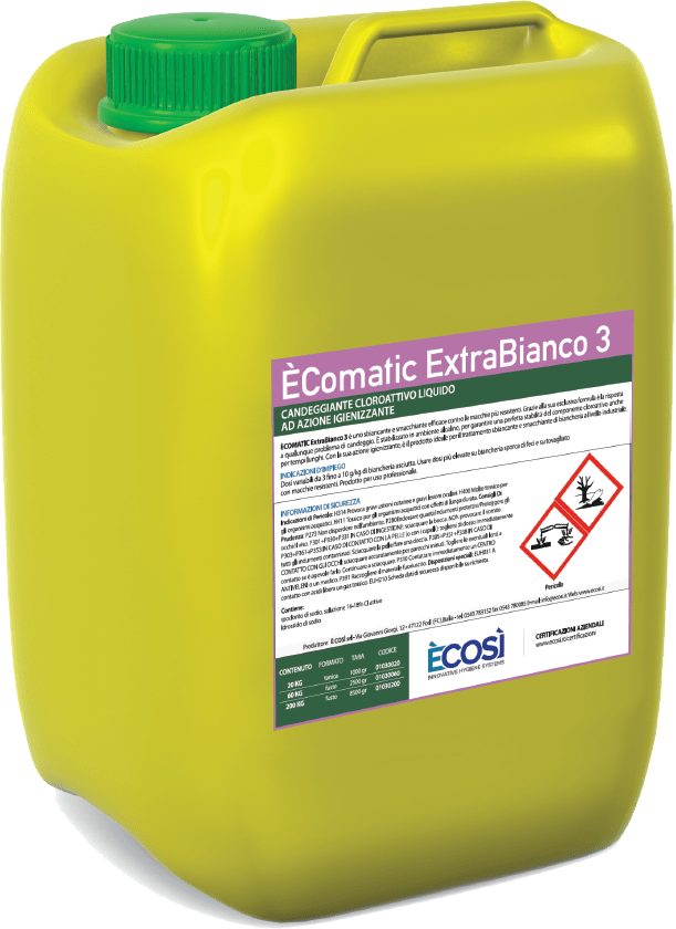E’COMATIC ExtraBianco 3 è un efficace sbiancante e smacchiante per lavanderie professionali. E’ stabilizzato in ambiente alcalino per garantire una perfetta persistenza nel tempo della componente cloroattiva. Esercita una decisa azione igienizzante e candeggiante.