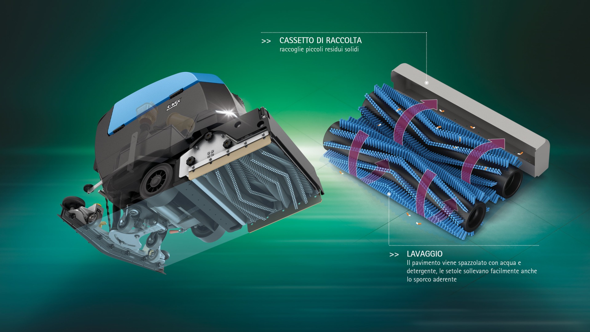 Il basamento a rullo si compone di due spazzole cilindriche controrotanti che eseguono oltre al lavaggio una leggera azione spazzante. L’azione spazzante rimuove i residui solidi non aderenti di piccola dimensione e li raccoglie in un cassetto installato nella parte posteriore del basamento, rimovibile per lo svuotamento. Questo tipo di basamento è indicato per pavimenti duri, anche strutturati, irregolari o antiscivolo. Le setole puliscono in profondità e garantiscono risultati ottimali anche in presenza di fughe importanti. Data l’elevata pressione specifica e la grande velocità di rotazione si preferisce l’utilizzo su pavimenti resistenti e non protetti da film polimerici (cere). Il movimento contro-rotante mantiene la soluzione detergente all’interno dell’area di lavaggio, aumentandone l’efficacia con bassi consumi di acqua.