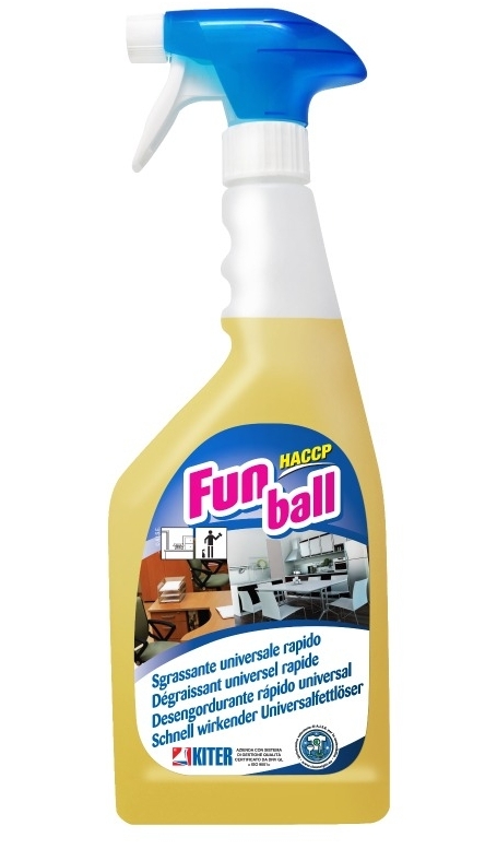 Sgrassante universale FUN BALL è stato appositamente formulato per eliminare accumuli grassi e oleosi, residui carboniosi, segni di inchiostro, timbri, pennarelli, segni neri di strisciate, sporco atmosferico stratificato, rossetto, ditate, da tutte le superfici lavabili.