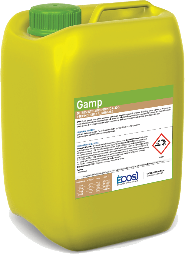 In conclusione, GAMP si presenta come un detergente altamente specializzato, caratterizzato da una potente azione acida e una capacità straordinaria di rimuovere residui organici ed inorganici da attrezzature impiegate nel settore alimentare, soprattutto in quello lattiero-caseario. La sua efficacia, sicurezza e versatilità lo rendono un alleato affidabile per garantire elevati standard igienici e di pulizia in ambienti sensibili come quelli delle industrie alimentari.