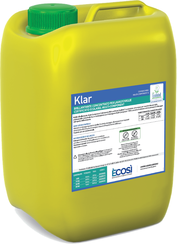 L’uso di KLAR non solo assicura una brillantezza impeccabile su stoviglie e superfici, ma sottolinea anche un impegno concreto verso la sostenibilità ambientale. Con certificazioni come Ecolabel e EPD, KLAR si posiziona come un leader nell’offerta di prodotti di pulizia altamente performanti e rispettosi dell’ambiente nel settore delle lavastoviglie professionali e industriali.