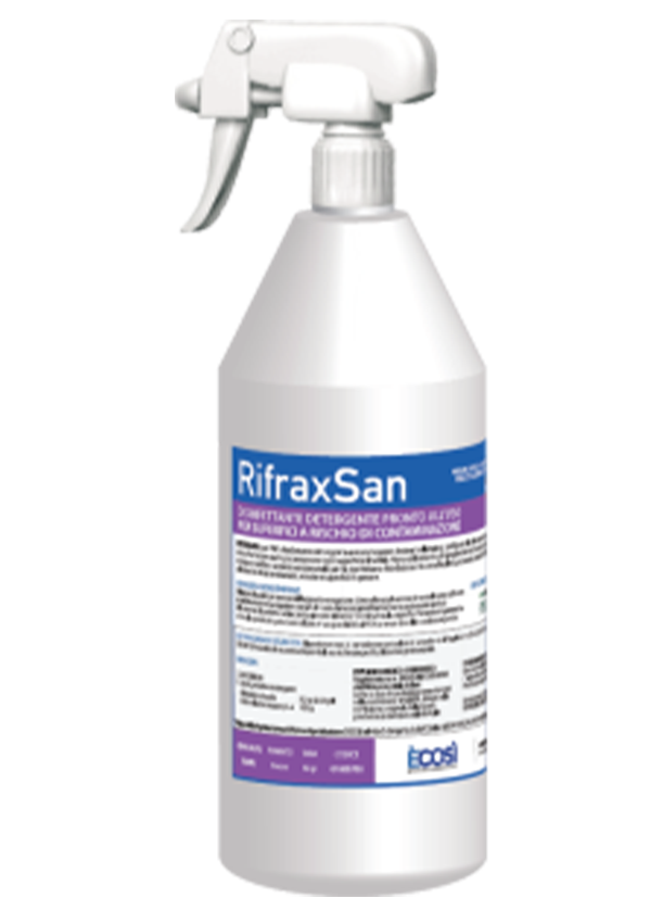 RIFRAXSAN è un PMC disinfettante detergente autoasciugante destinato all’impiego per il controllo di batteri (sia Gram+ che Gram-), micobatteri, funghi, spore e virus. Può essere usato per preservare ogni superficie lavabile dai rischi di contaminazione. Si impiega in ambito sanitario-assistenziale, alimentare e civile per la disinfezione quotidiana di arredi, mobili, sanitari, vetrate, attrezzature di cucina e superfici in genere.