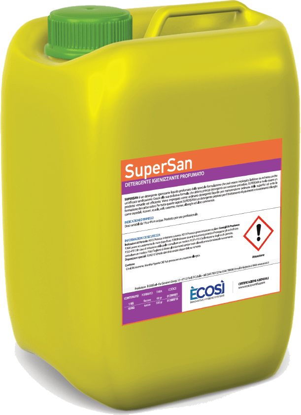 La sua composizione liquida permette un’applicazione agevole su diverse superfici, assicurando una pulizia completa e un’efficace azione igienizzante senza compromettere la delicatezza dei materiali trattati. La capacità di SUPERSAN di eliminare i cattivi odori è particolarmente vantaggiosa in ambienti dove l’igiene e la freschezza sono fondamentali per garantire un ambiente sano e accogliente.